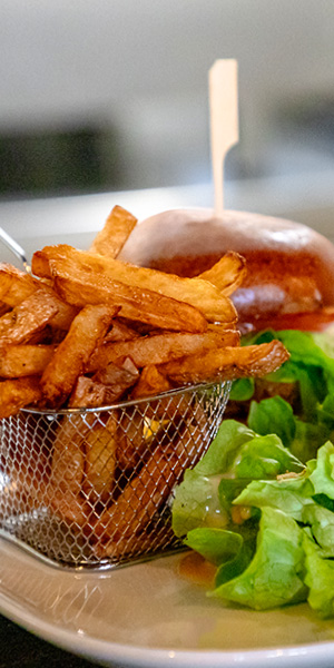 Salade et frites en accompagnement.